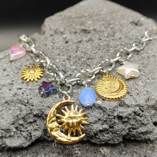 Pulsera de Acero Inoxidable 304, Color Plateado, Dorado, Estilo Elegante, Boutique, Tendencia, Dijes, Luna, Piedra Artificial, Unisexo, Moda